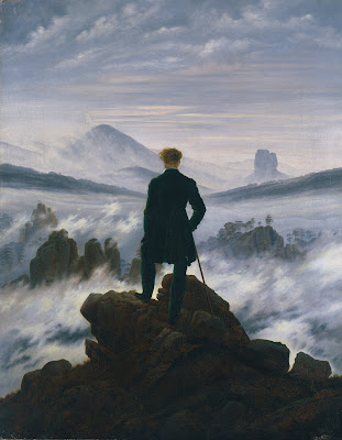 The picture is Caspar David Friedrich's Wanderer above the Sea of Fog. A curly-haired man in a dark green suit is seen from behind, standing atop a rocky outcrop with his walking stick and gazing down into an eerie landscape in which mists swirl around mountain tops.