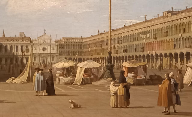 Canaletto's extensive output and, let's be fair, a certain repetition of subject matter, might lead you to think he just whipped off one painting after another in a hurried fashion to meet the demands of those young lords eager for reminders of their Grand Tour. But it's absolutely worth taking the time to explore the details of these pictures; Canaletto was surely influenced in some fashion by the Dutch cityscapes from the previous century of artists like Gerrit Berckheyde or the church scenes of Emanuel de Witte, with their profusion of human and canine incident.